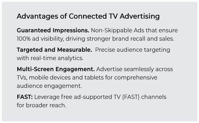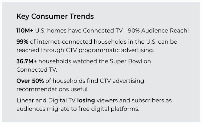 The rapid growth of Connected TV has already been embraced by major consumer brands and "pure play" retailers who are actively switching their traditional TV marketing budgets and advertising spends to Connected TV. U.S. CTV advertising spends alone were more than $25 billion last year... a figure that continue to grow!