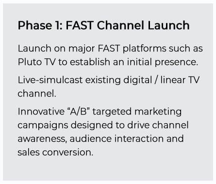 Connected TV can offer the same opportunity for TV Home Shopping Networks and DRTV advertisers to adopt this new medium and by doing so, reach, engage and transact with new audiences both domesti- cally and worldwide by firstly transitioning their existing broadcast model by launching a FAST channel before fully migrating their broadcast services to Connected TV.