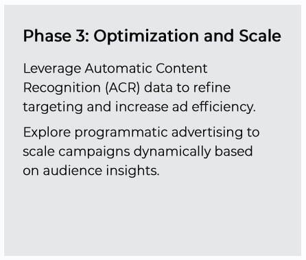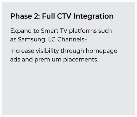 Free Ad-Supported Streaming Television (FAST) offers established digital and linear TV channels the opportunity to reach CTV audiences and expand their overall audience reach, by seamlessly inte- grating existing 24/7 channels for minimal investment on platforms like Pluto TV, Roku, and Samsung TV Plus. Alternatively, programmers and advertisers could consider a more prudent approach to bridging the gap by first partnering with leading CTV providers such as Samsung TV and LG Channels to produce and trial innovative, cost-effective, targeted advertising campaigns.